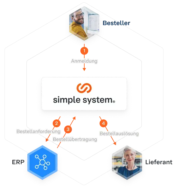 Der Besteller kann direkt auf die Kataloge und Preislisten des Anbieters zugreifen. Nachdem der Warenkorb abgeschickt wird, erfolgt die automatische Erstellung einer Bestellanforderung, wo auch die Genehmigung stattfindet. Anschließend wird die Bestellung über "simple system" an den Lieferanten übermittelt.